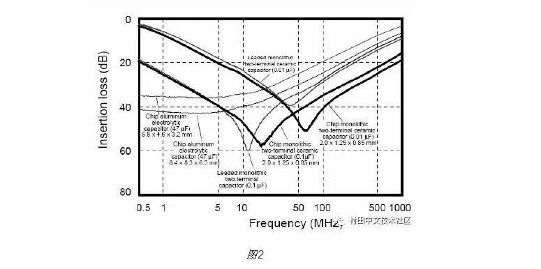 可見,當(dāng)頻率很低的時候是電容起作用,而頻率高到一定程度電感的作用就不可忽視了;再高的時候電感就起主導(dǎo)作用了,電容就失去濾波的作用了。所以記住,高頻的時候電容就不是單純的電容了。實際電容的濾波曲線如圖2所示。